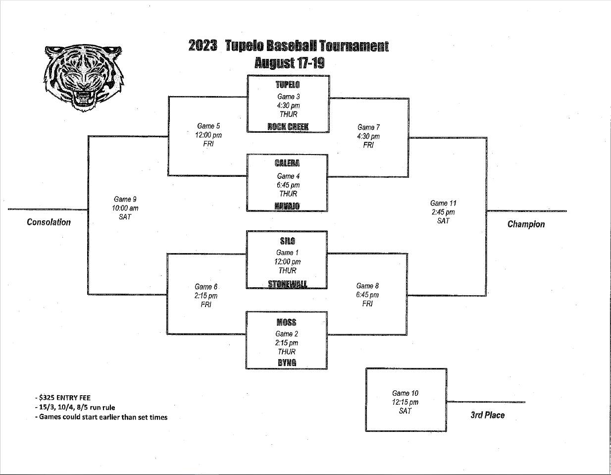 There are 6 tournaments/festivals (that I’ve seen) being played this coming weekdn in Okahoma and one of the better ones is being played in the town of Tupelo. The high school southeast of Ada will be hosting a 8 team, double elimination bracket starting at noon on Thursday.