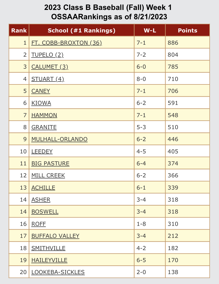 - Ft Cobb-Broxton is where they should be. Their only loss was a 1 run game to SSBR and OSSAA Class A #2 Dale.