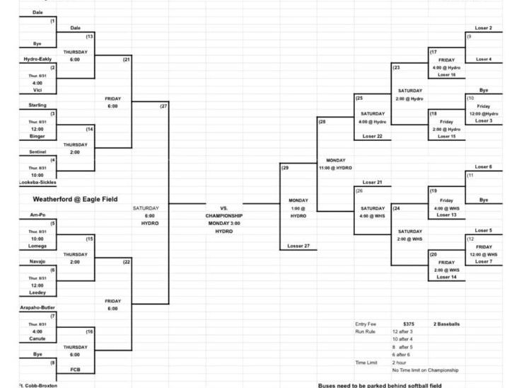 The tournament will have 14 teams total and will be played at 2 sites: Hydro-Eakly and Eagle Field in Weatherford. It will be played over 5 days (Thurs-Mon) with Sunday being an off day. It is a double elimination format until the championship game so a team can theoretically play 8 games in those 4 days of play.