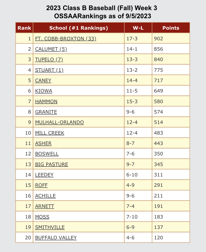 - With a perfect week last week and winning the Hydro-Eakly Labor Day Tournament, Ft Cobb-Broxton received 4 more 1st place votes than week 2.