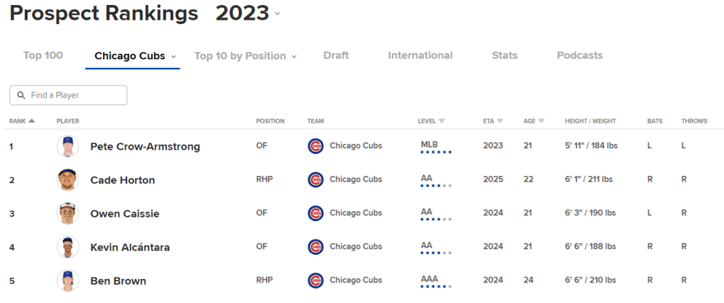 Horton has been so dominant this year that he has moved up the Cubs’ prospect list to the #2 overall prospect for the Cubs and is a top 50 overall prospect coming in at #29. He is estimated to enter the Majors during the 2025 season.