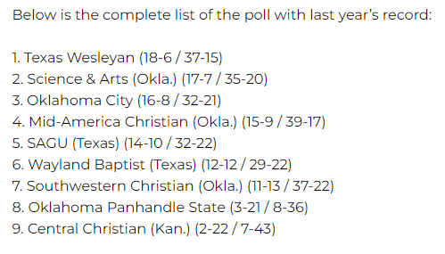 Defending 2023 regular season champion, Texas Wesleyan was picked at #1. They finished the ’23 season with a conference record of 18-6 (37-15 overall). TWU was an at-large bid to the NAIA National Tournament in ’23.