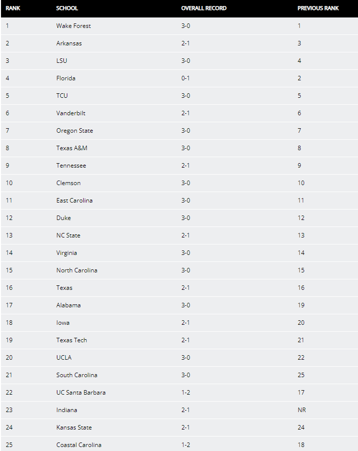 These came out on Monday so OU’s loss to Dallas Baptist hadn’t happened yet. Having said that, I found it “odd” that OU went 2-1 in their opening weekend in Arlington and gave the preseason #9 team, Tennessee, it’s loss and the Volunteers didn’t drop nor did the Sooners enter the rankings.