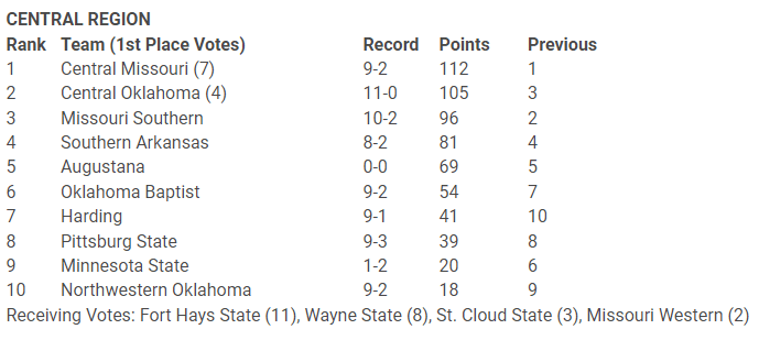 D2 also does “regional rankings” which is supposed to help with postseason play since D2 does a true regional system to start it’s national tournament. You’ll see the national poll then the Central Region rankings since that is the region the Oklahoma schools are in.