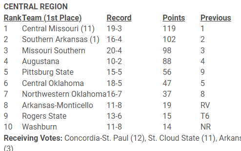 NWOSU joins UCO in the Central Region rankings right behind them. These rankings were done before Tuesday, so it’ll be interesting to see how the voters react to the Rangers losing to OK Panhandle State – an NAIA team.
