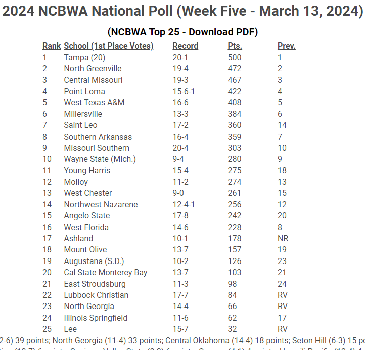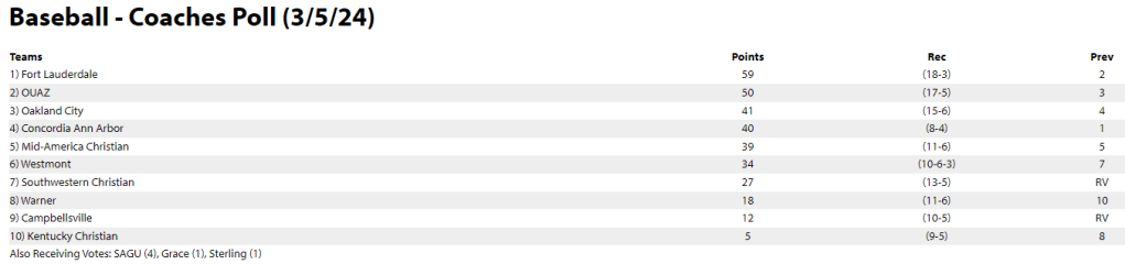 Rogers State fell 3 spots to #9 after getting swept by Pittsburg State. After losing on Tuesday as well, their series this weekend at Emporia State is a big one.