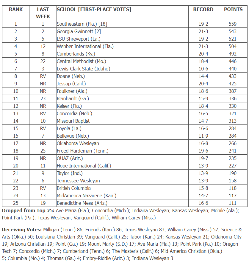 USAO and OCU are still receiving votes as they should. OCU’s record is at 15-10, but they have played one of the toughest schedules out there. They’ve played #6 Central Methodist, #8 Doane, #14 Missouri Baptist, #15 Bellevue, #17 OKWU, #18 Freed-Hardeman, and #24 MidAmerica Nazarene (they have wins over Central Methodist, Bellevue, OKWU, Freed-Hardeman (2x).