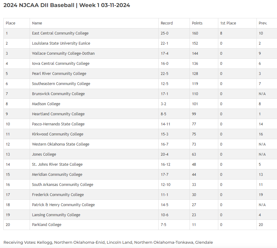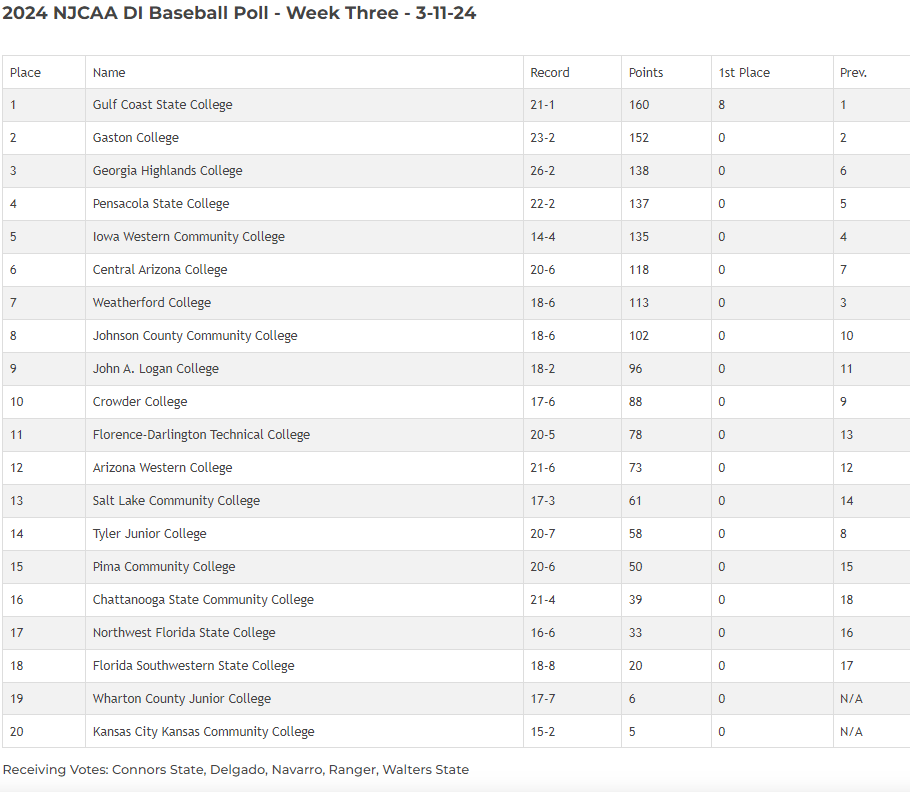 *I also checked on the PBR JUCO rankings. The last poll they had was 3/1/24 and had Connors St receiving votes as well.