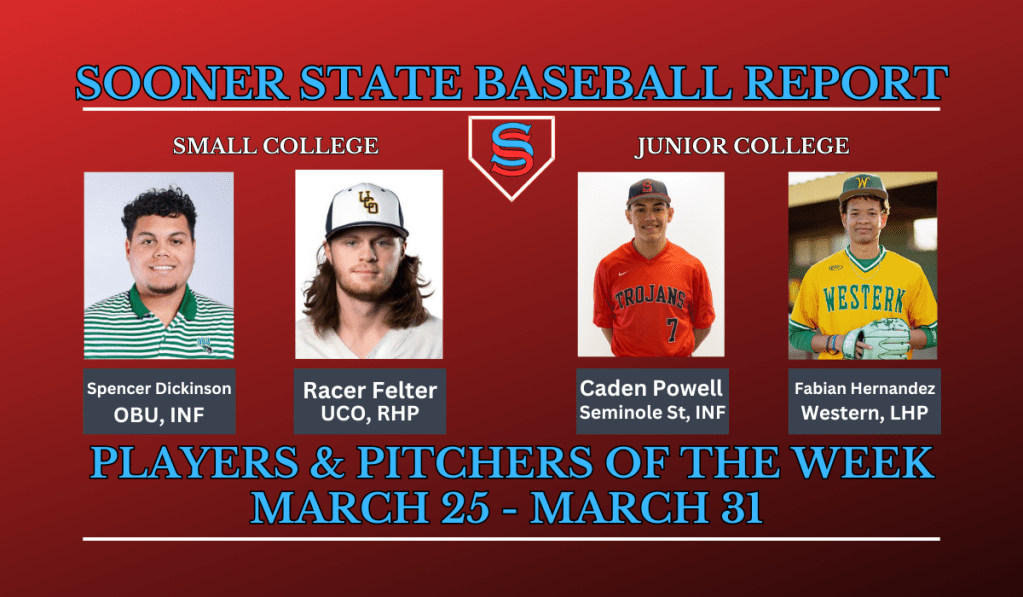 With it being our 2nd season here at Sooner State Baseball Report, we are trying some new things out to make our coverage even better. One of those things is awarding a Player of the Week and a Pitcher of the Week for the various levels. Each week we will send out a nomination form to each head coach and we will pick from those nominations.