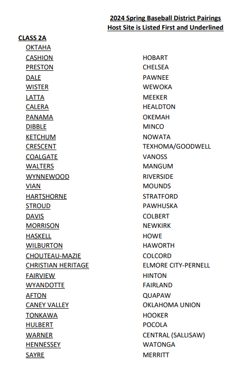 There are 63 teams in Class 2A with each district being a two team affair that is best 2 out of 3 games. By virtue of being ranked number 1 by the coaches, Oktaha will receive a bye into regionals.