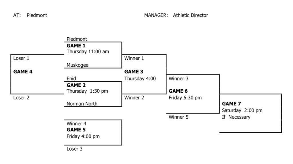 There are 4 – 8 team brackets in the Regionals and each are a double elimination bracket. Brackets are scheduled to start on Thursday, but they can be started early (no earlier than Tuesday) if each team agrees to do so.