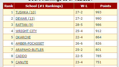 As you can see, the top 3 schools – Tushka, Dewar, and Rattan – are separated by just 7 overall points. Dewar has more 1st place votes than #1 Tushka while 3rd place Rattan has just one fewer than Tushka. This is not to mention that Wright City has over 900 points themselves.