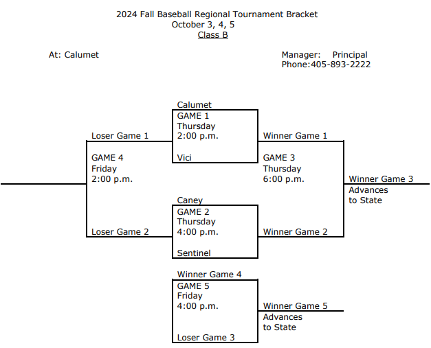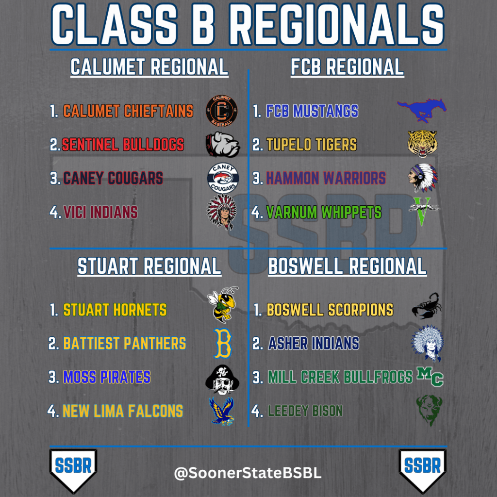 Below you will find the brackets for each Regional with Calumet, Ft Cobb-Broxton, Stuart, and Boswell hosting a Regional. This was based on the final OSSAA rankings that came out on September 23.