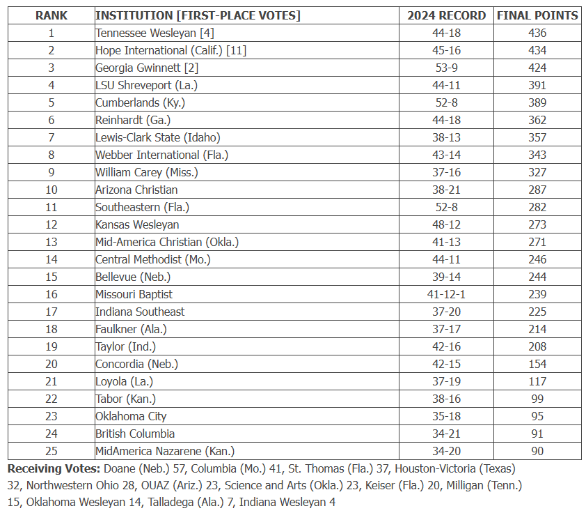 USAO and OK Wesleyan did not make the top 25, but they did receive votes.