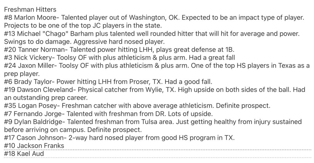 - Austin Haley (INF/RHP), 2024: G 40, .307/.386/.527, 7 HR, 38 RBI, 12 2B, 13 BB – 2 way player that projects to hit 3rd in the lineup & a top arm on the staff. Will be one of the top JUCO players in Oklahoma