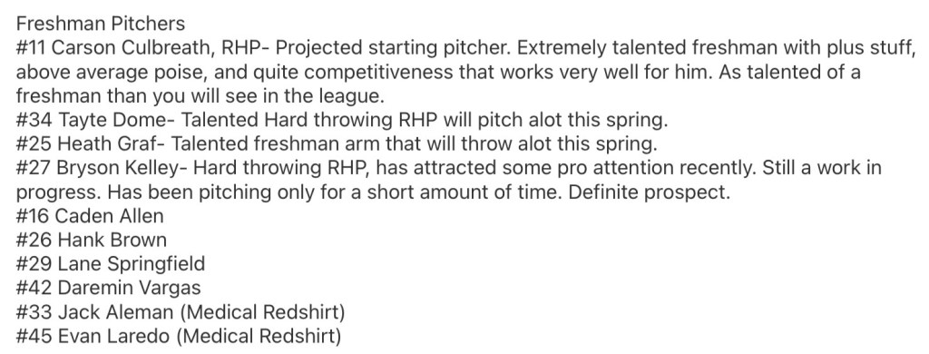 - Kydon Lovell (LHP), 2024: G 10, 1-1, 6.75 ERA, 13.1 IP, 8 H, 16 BB, 11 SO – Highest upside on staff; consistency is key; will start and relieve; “X-factor”
