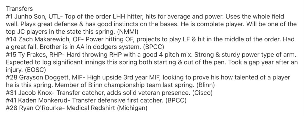 After a disappointing 2024, Coach Bjorling and the staff retooled the roster. Austin Haley and Brennan Morgan are the top 2 returning players in the everyday lineup and after that it will be mostly new faces with some of them top level transfers and some of them elite players high school players from the region.