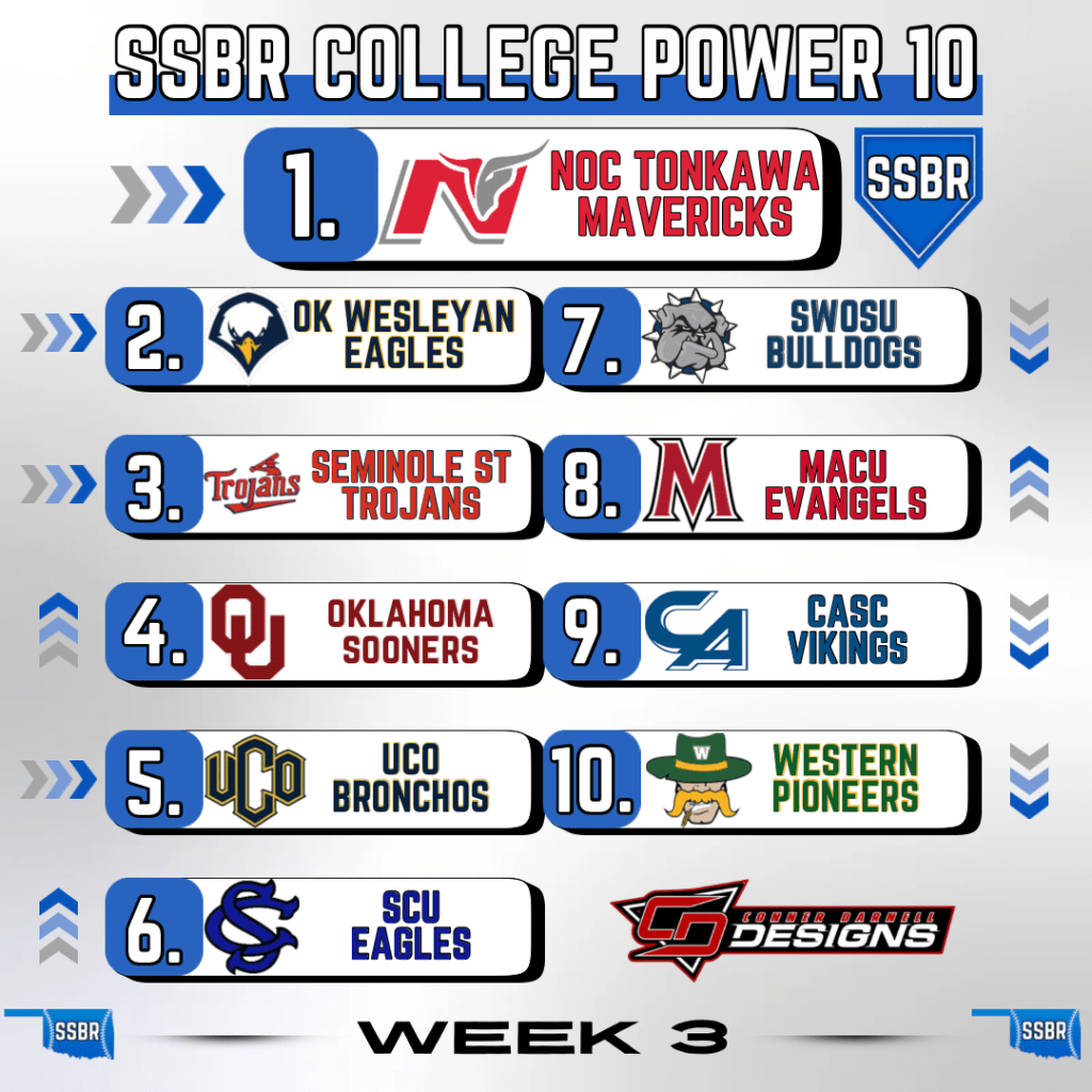 With OU debuting and UCO and SCU going undefeated this past week, SWOSU slides a few spots to #7 after splitting a pair of games vs Arkansas Tech. The Bulldogs were scheduled for three against the Wonder Boys, but game 3 was cancelled due to weather.