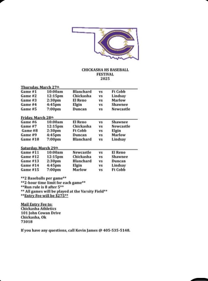 Chickasha comes into the event with a 9-3 record. Make no mistakes about it, the Chicks are a legit state championship contender. Two of their three losses are to Mount St Mary (another 4A contender) and Blanchard. Layton Bryan is one of the best pitchers in the state and his teammate, Tyson Owens has already thrown a no hitter this season.