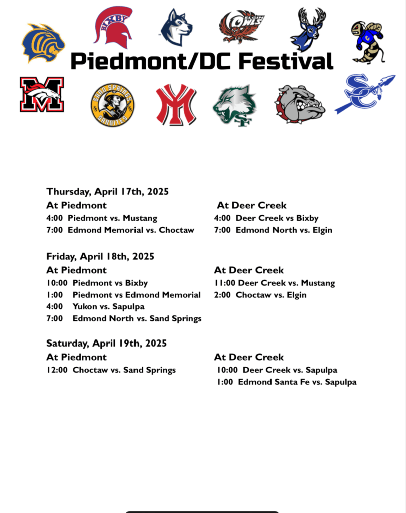 With that in mind, we won’t likely get the grouping of large schools in one place like at Piedmont and Deer Creek this week until the postseason. At total of 12 schools will participate in the Piedmont/Deer Creek Festival with 11 of the teams from 6A and Elgin who is from 5A.