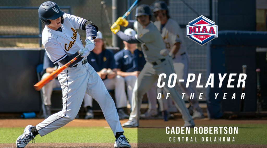 Caden Robertson (OF) of UCO was named Co-Player of the Year (along with Central Missouri’s Jacob Steele). Robertson led the MIAA in both HR (22), RBI (73), and SLG (.857). He was also top 10 in the league in batting AVG (.376), hits (71), runs scored (61), and doubles (19).