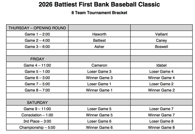 Battiest High School is hosting the First Bank Classic. It is a true 8 team, tournament with each team guaranteed 3 games.