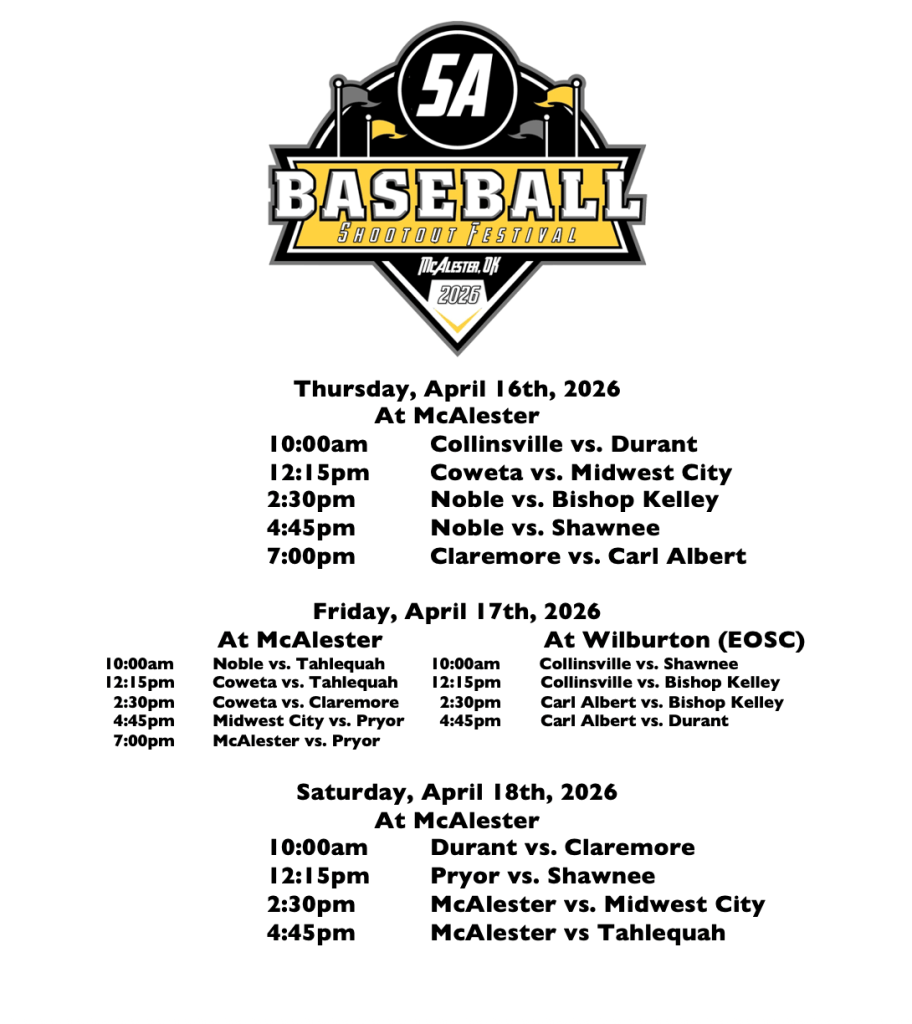 A total of 12 teams from 5A will play over 3 days with Eastern OK State College serving a host for 4 games on Friday as well.