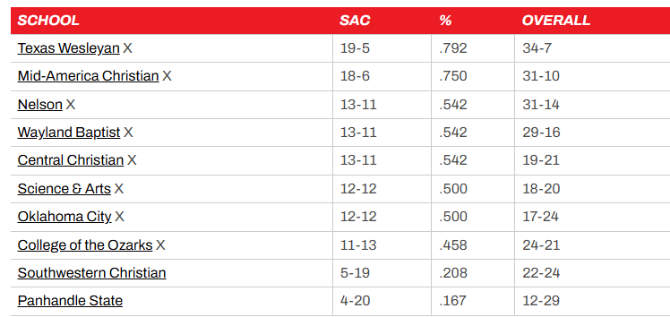With 2 weeks to go in regular season play, the top 8 teams have clinched their spots as Southwestern Christian and OK Panhandle State cannot make up the distance to finish in the top 8.