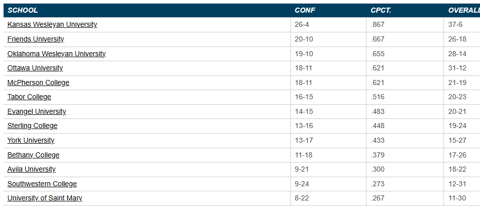 OK Wesleyan sits in 3rd a half game behind Friends. The Eagles have 7 games left: 3 vs Avila, 1 vs Evangel, and 3 at Sterling. OKWU can tie Kansas Wesleyan theoretically, but they lose the tiebreaker. They are playing for seeding at this point.