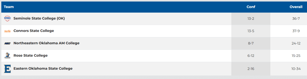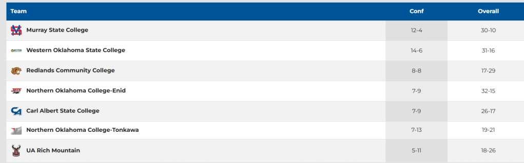We are half way through the season for our Division 1 schools. All 5 teams make the Region tournament. Seminole State and NEO have played only 15 games compared to the other teams’ 18. The Trojans and Norsemen play this week.