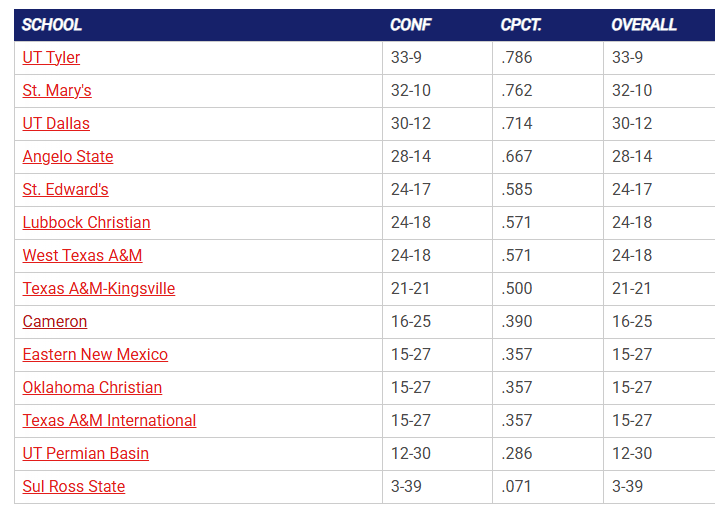 OK Wesleyan is the only team from Oklahoma in this league. Like the SAC, the KCAC is a 2 auto bid conference – regular season and KCAC Tournament champions.